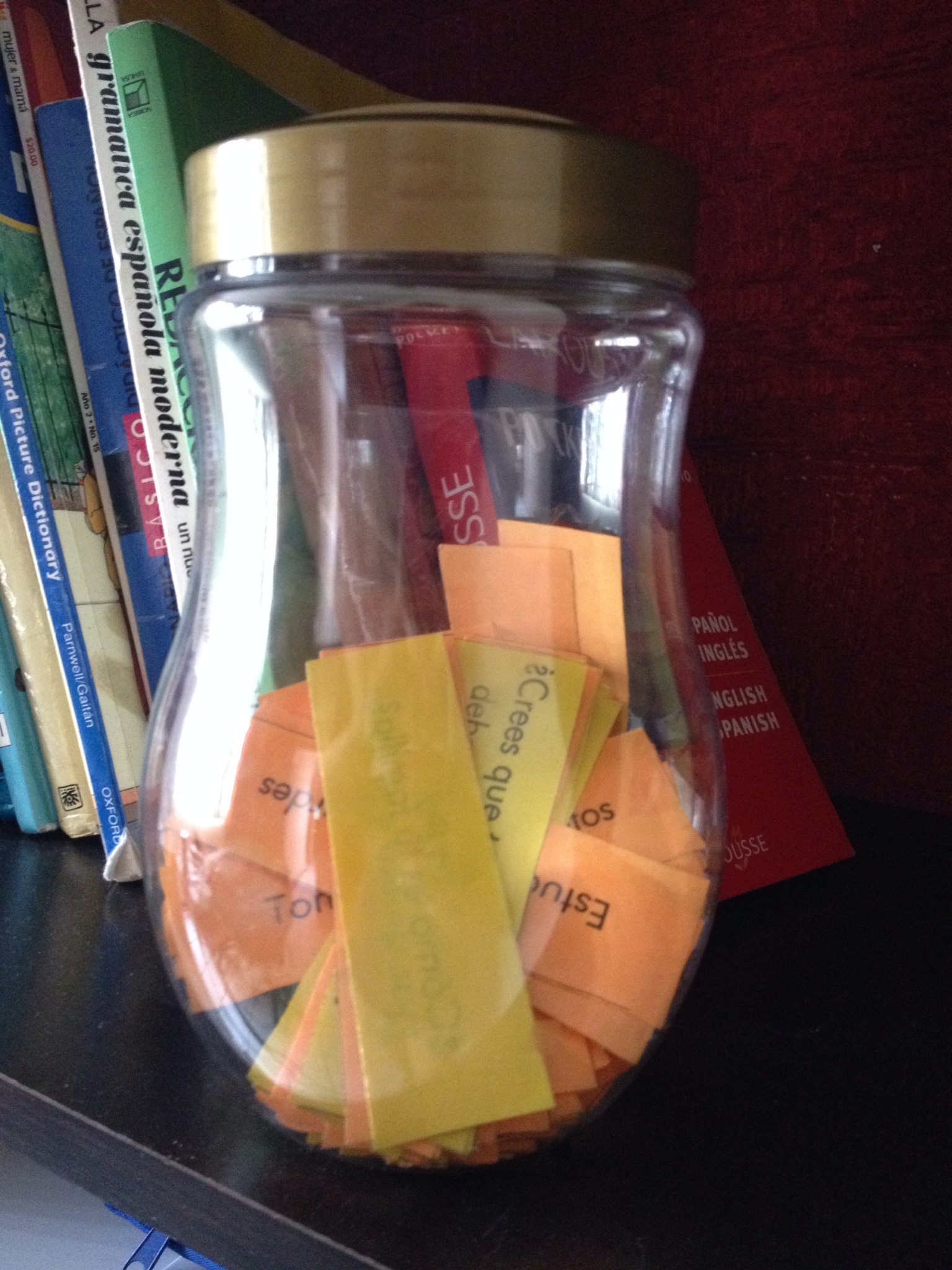 8. El bote de opinión. Hace tiempo conseguí un bote en el que guardé varias tiras de papel con un tema escrito. Algunos de los temas que tengo allí son: “¿Crees que es importante estudiar otro idioma?”, “¿por qué te gusta ir al parque?”, “¿crees que los niños deben hacer lo que sus papás dicen?”, y un largo etcétera. A veces hacemos una “mesa de discusión” en la que cada quien va sacando un tema y todos damos nuestra opinión sobre él y al final cada quien escribe sus propias conclusiones. O también, a veces simplemente alguien va, saca una tira de papel y escribe algo sobre ese tema. Aquí puedes ver todas las preguntas que tengo en mi bote.